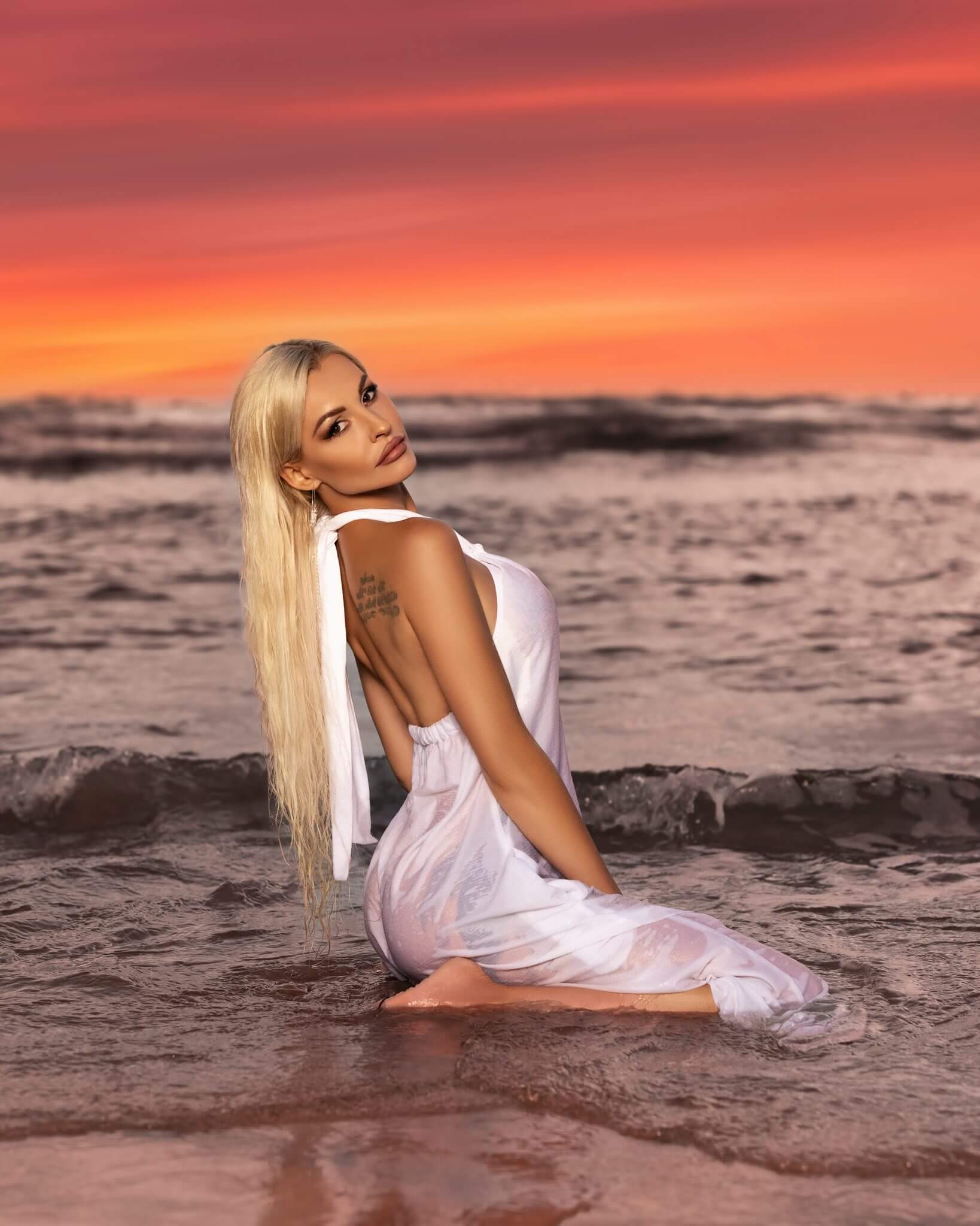 Golden-hour coastline. Structured posing. Swimwear leaves very little room for error — which is why lighting and direction matter.